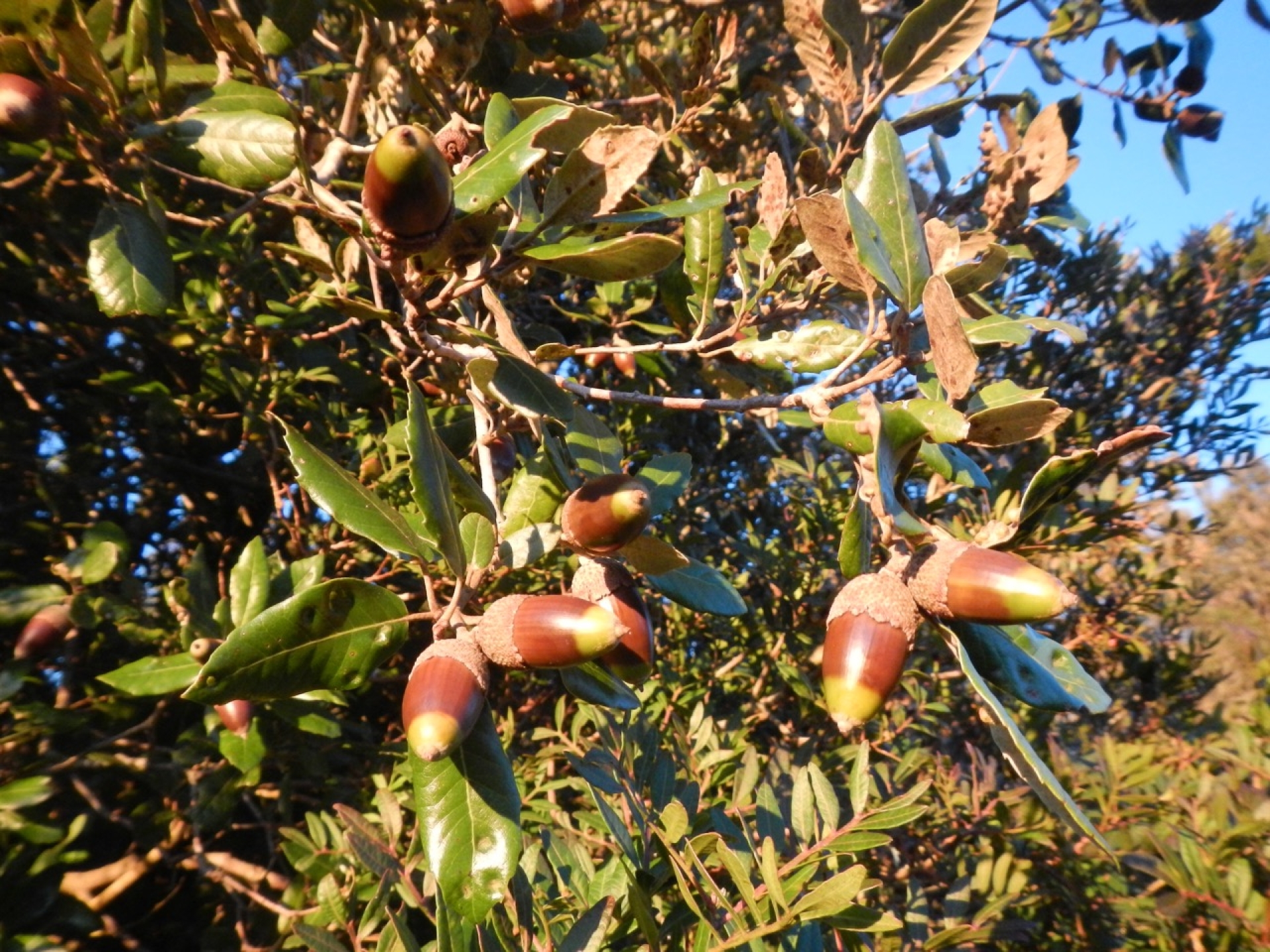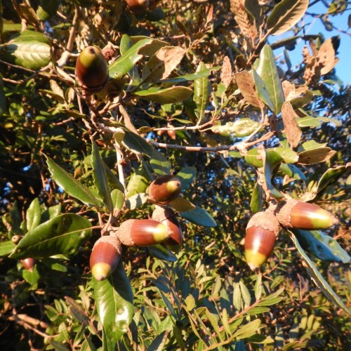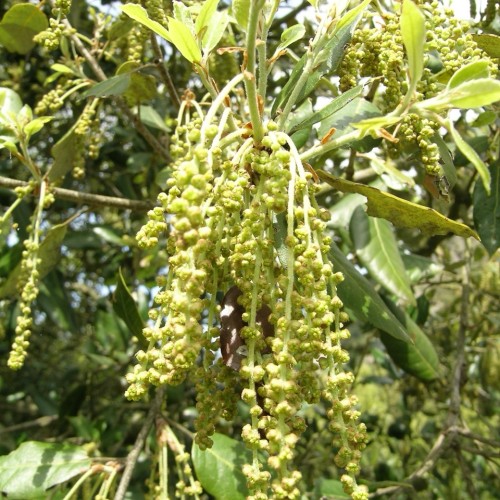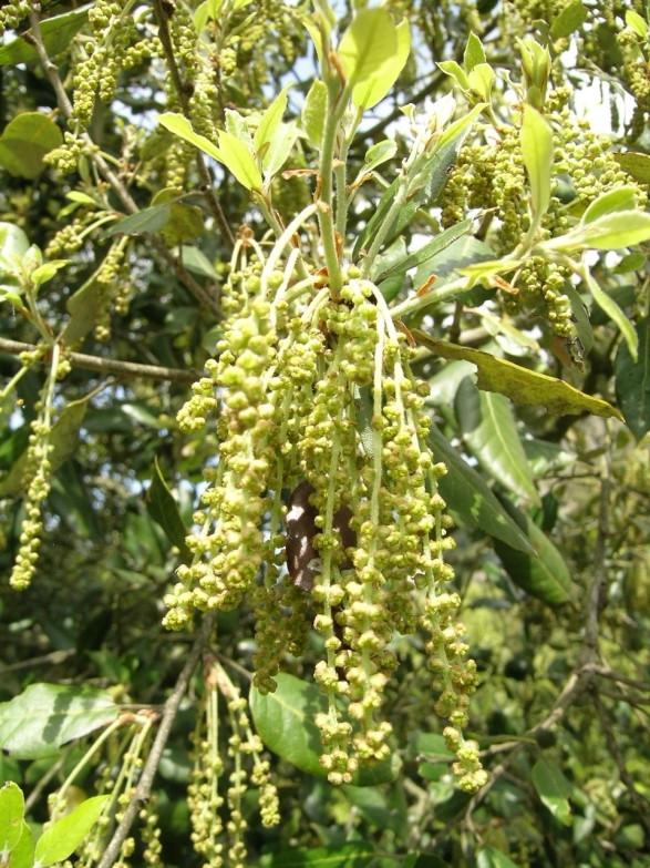 Le foglie sono sempreverdi e il loro margine può variare a seconda dell'età della pianta. Le foglie più basse e più giovani possono essere seghettate e dentellate, con tanti piccoli aculei. Nella pianta adulta, le foglie sono coriacee, dalla forma ellittica fino a lanceolata, dal margine liscio, con la pagina superiore lucida di un verde scuro e quella inferiore più chiara e feltrosa. La fioritura avviene in primavera inoltrata, tra aprile e maggio, con fiori unisessuali, con quelli femminili piccoli e poco visibili e con i maschili raccolti in amenti penduli di 4-6 centimetri di lunghezza. I frutti sono le ghiande che maturano nell'anno, nel periodo autunnale.